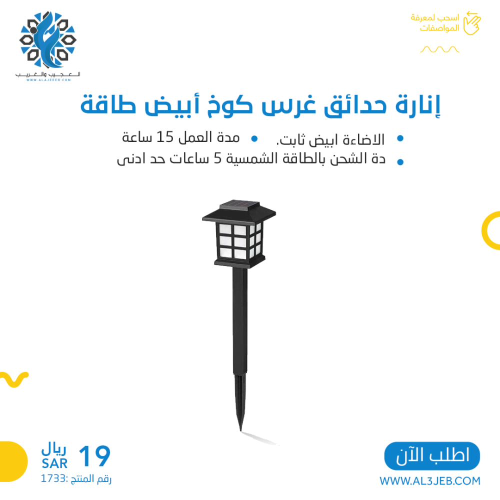 - يمكنك الحصول على "إنارة حدائق غرس كوخ أبيض طاقة" الآن من متجر العجيب والغريب بالإضافة إلى الكثير من المنتجات الأخرى إذا قمت بزيارة موقعنا، قم بالطلب الآن نصلك بأقصى سرعة.