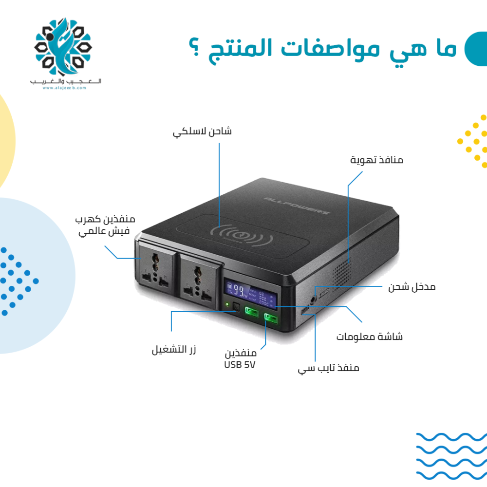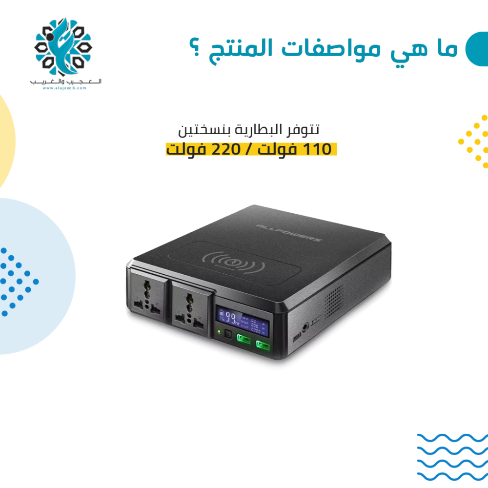 - يأتي المنتج مع مدخل ومخرج للكرباء ٢٢٠ فولت والذي يمكنك من تشغيل أجهزة منزلية معك في رحلتك البرية.