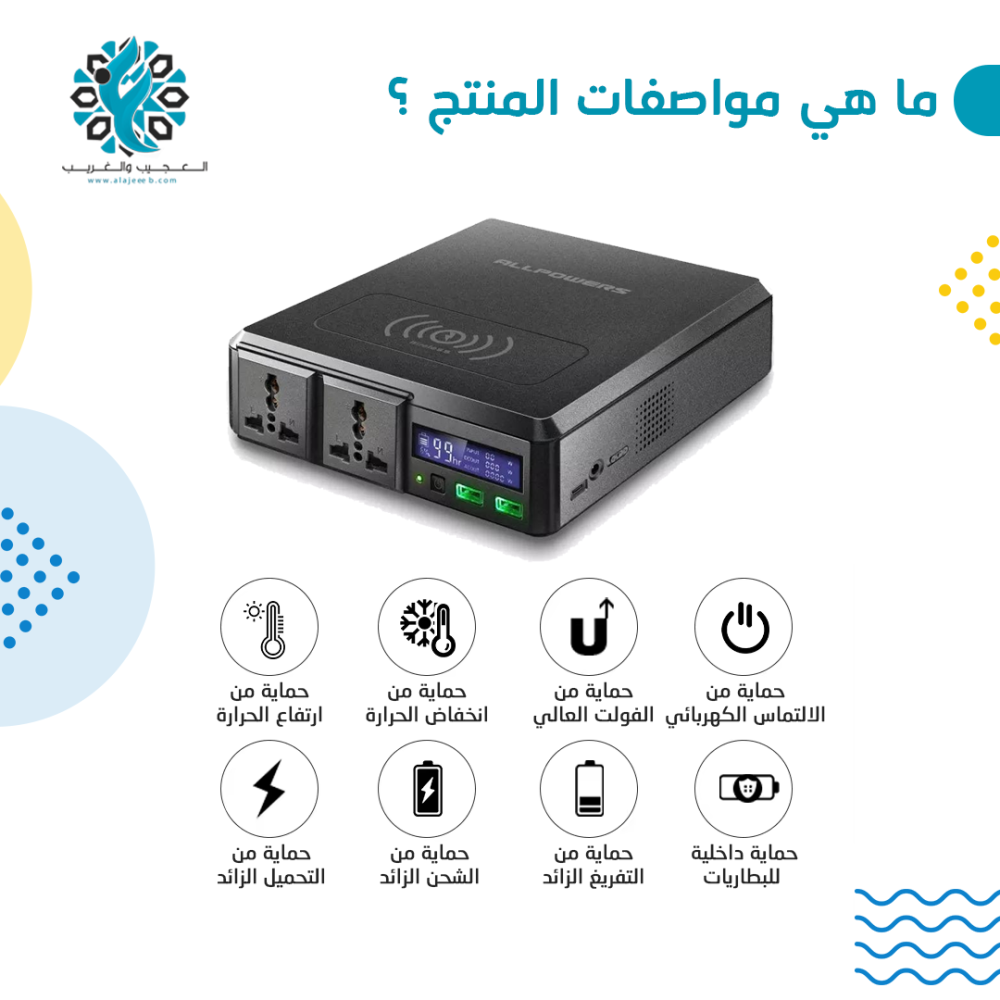 - مزودة بنظام إدارة البطارية الذكي الذي يتحكم في الجهد الكهربائي ودرجة الحرارة، والذي يضمن الحماية الكاملة لك و لأجهزتك من التيار الزائد والحرارة الزائدة.