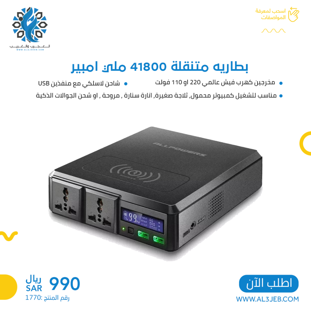 - توفر بطارية مع شاحن متنقل 41800 مل أمبير مخرجين USB لشحن الأجهزة التي تعمل بجهد 5 فولت بكفاءة عالية.