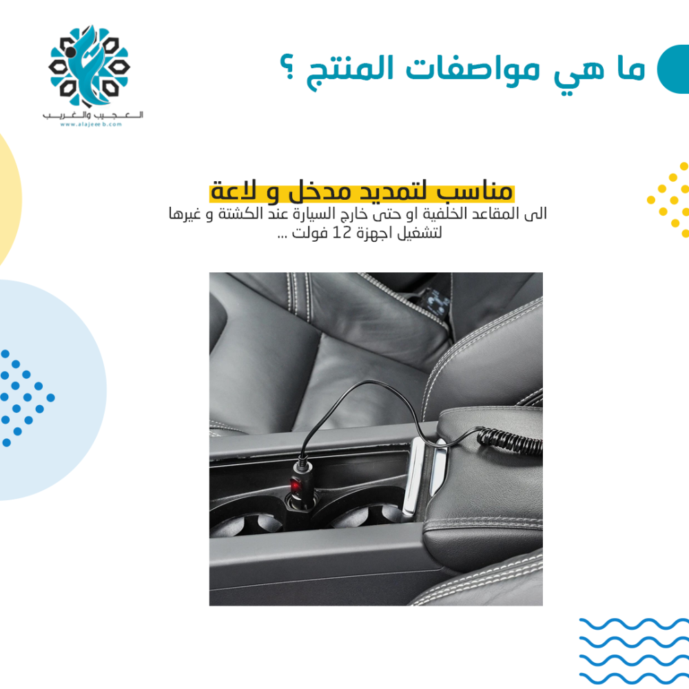 - مناسب لتمديد مدخل ولاعة الى المقاعد الخلفية أو حتى خارج السيارة عند الكشتة وغيرها لتشغيل أجهزة 12 فولت.