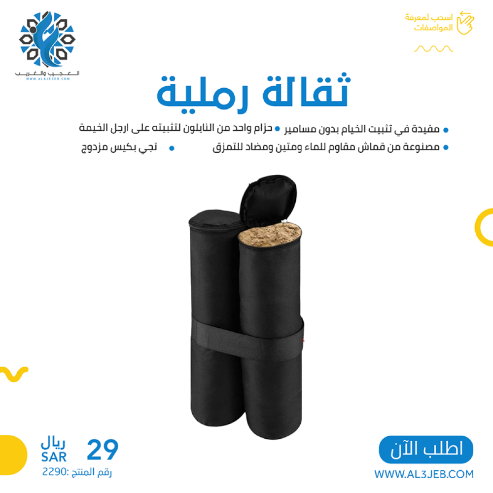 - تعد الثقالة الرملية خيارًا مثاليًا للرحلات و الكشتات في البر, حيث يمكن استخدامها بسهولة لتوفير الثبات والاستقرار للخيام.
