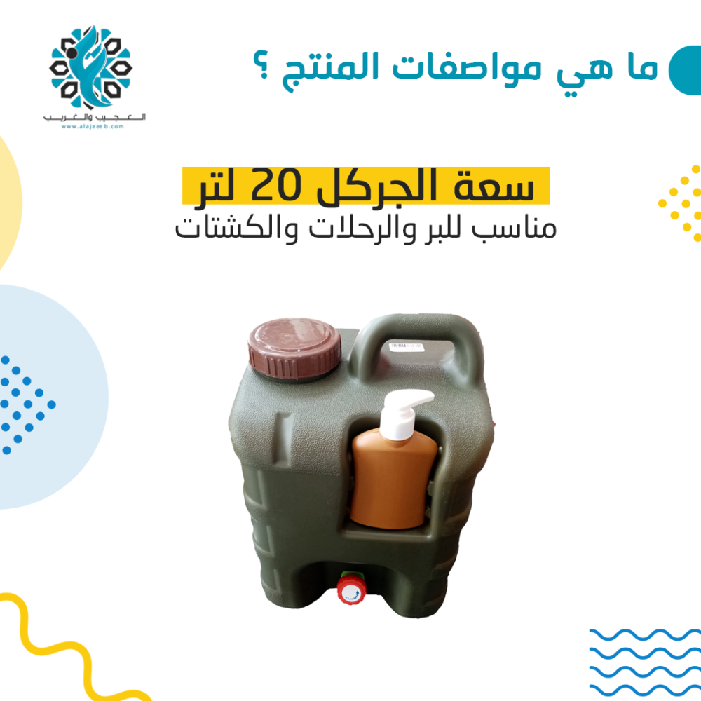 - استمتع برحلات البر والطلعات والكشتات دون الحاجة للقلق بشأن المياه، فجركل بري 20 لتر مع علبة صابون يضمن لك الراحة والنظافة أينما كنت.