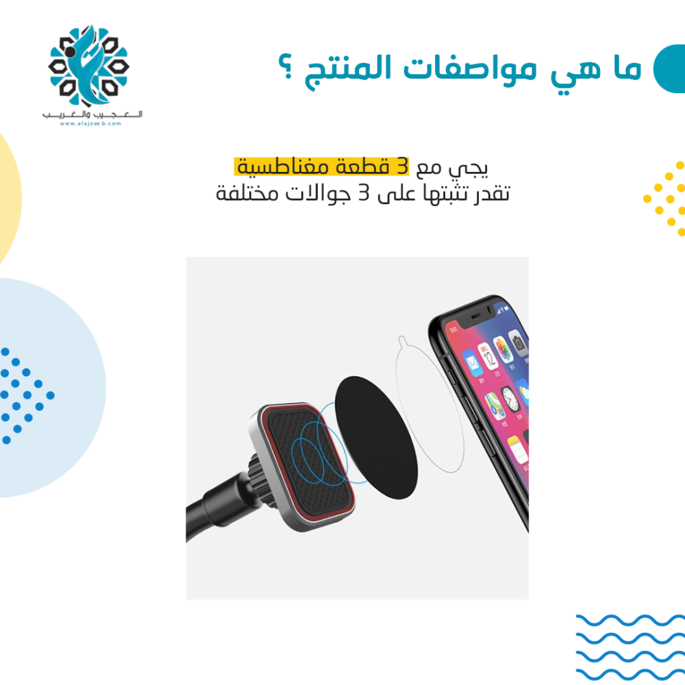 - يأتي مع 3 قطعة مغناطسية تقدر تثبتها على 3 جوالات مختلفة.
