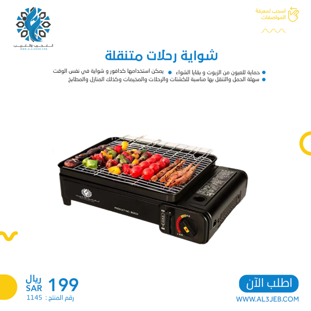 - يمكنك الحصول على "شواية رحلات متنقلة" الآن من متجر العجيب والغريب بالإضافة إلى الكثير من المنتجات الأخرى إذا قمت بزيارة موقعنا، قم بالطلب الآن عبر طرق الاتصال المتعددة المتواجدة في أسفل الصفحة نصلك بأقصى سرعة.