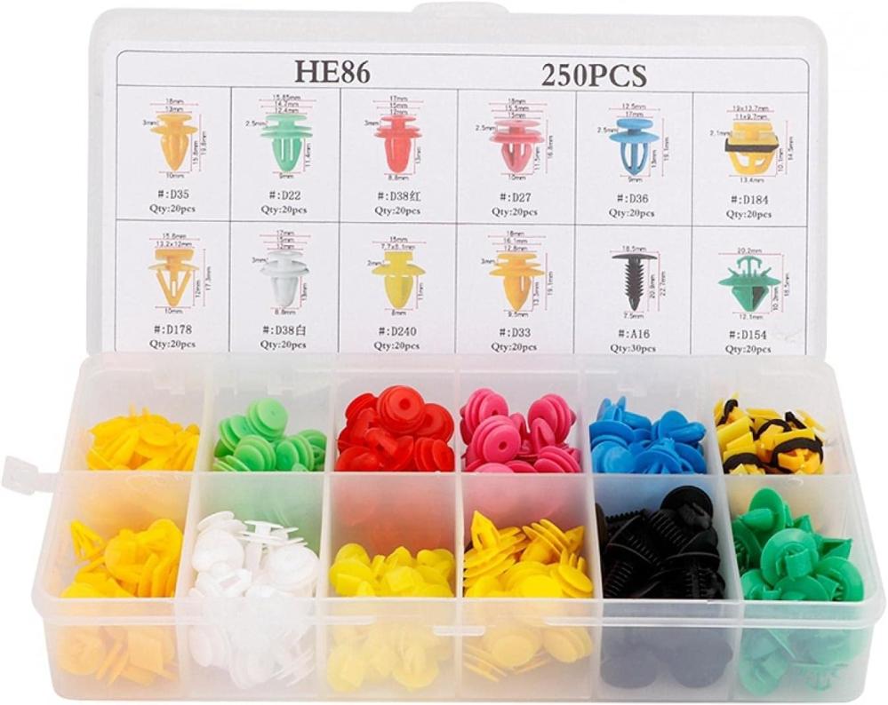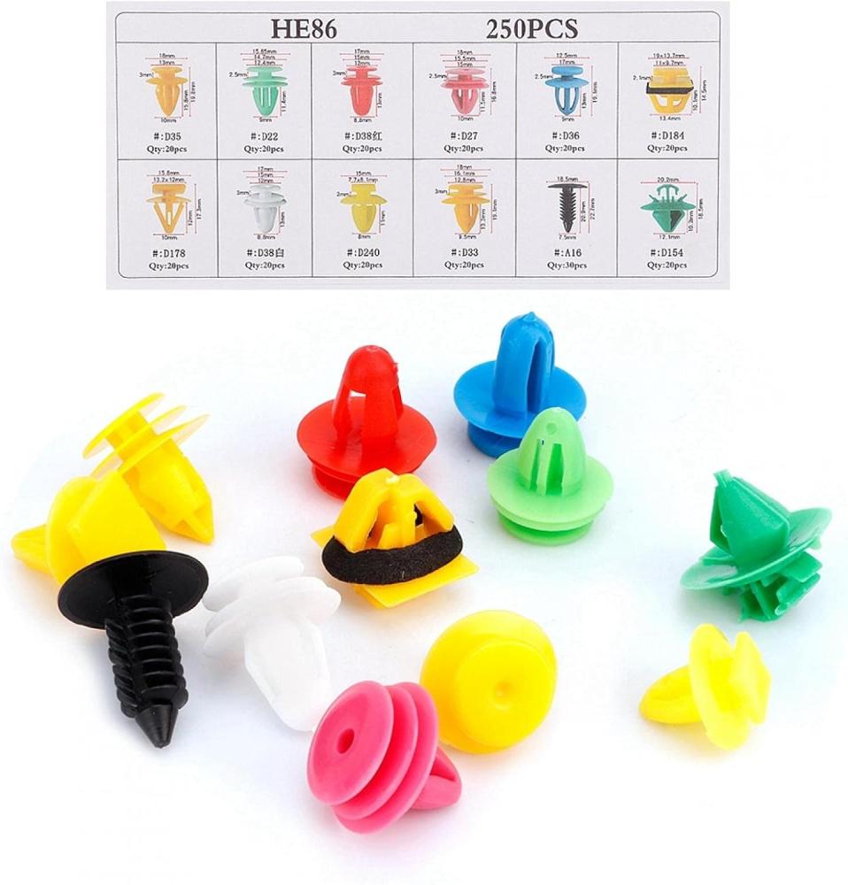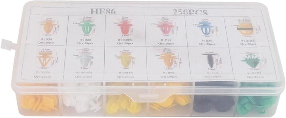 - مع طقم كلبسات سيارات 250 قطعة، أصبح بإمكانك الآن تثبيت أجزاء جسم السيارة، لوحاتها، وأجزاء داخلية بسهولة وسرعة، مع ضمان التثبيت الآمن والمستدام.