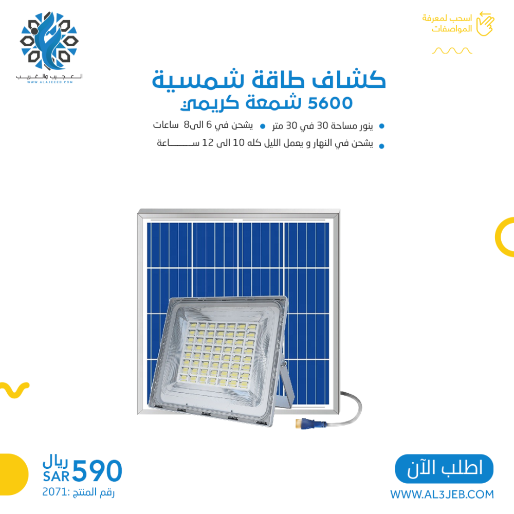 - يمكنك الحصول على "كشاف طاقة شمسية 5600 شمعة كريمي" الآن من متجر العجيب والغريب بالإضافة إلى الكثير من المنتجات الأخرى إذا قمت بزيارة موقعنا، قم بالطلب الآن نصلك بأقصى سرعة.