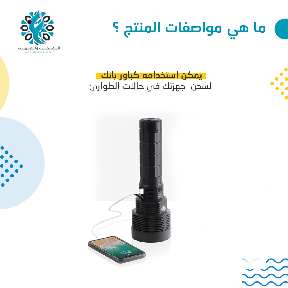 - بالإضافة إلى كونه كشاف يدوي، يمكن استخدامه كبور بانك لشحن الأجهزة المحمولة، وبالتالي يوفر مصدر طاقة إضافي للطوارئ.