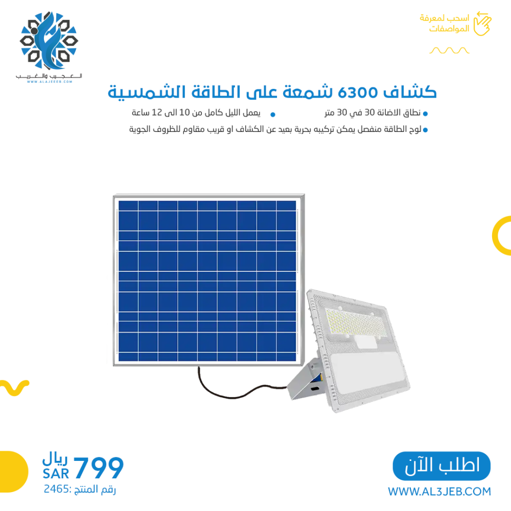 كشاف 6300 شمعة مع لوح منفصل على الطاقة الشمسية
