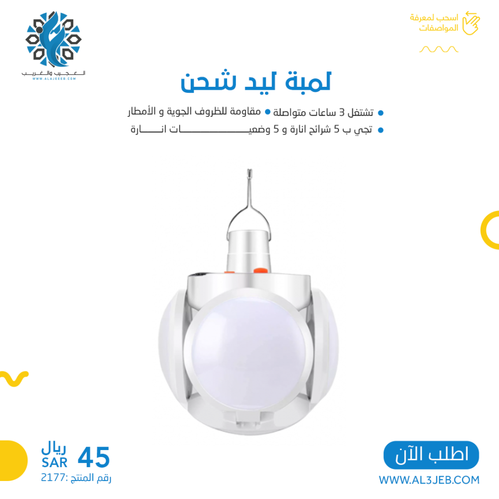 - يمكنك الحصول على "لمبة تخييم شحن وطاقة شمسية 5 شرائح" الآن من متجر العجيب والغريب بالإضافة إلى الكثير من المنتجات الأخرى إذا قمت بزيارة موقعنا، قم بالطلب الآن نصلك بأقصى سرعة.
