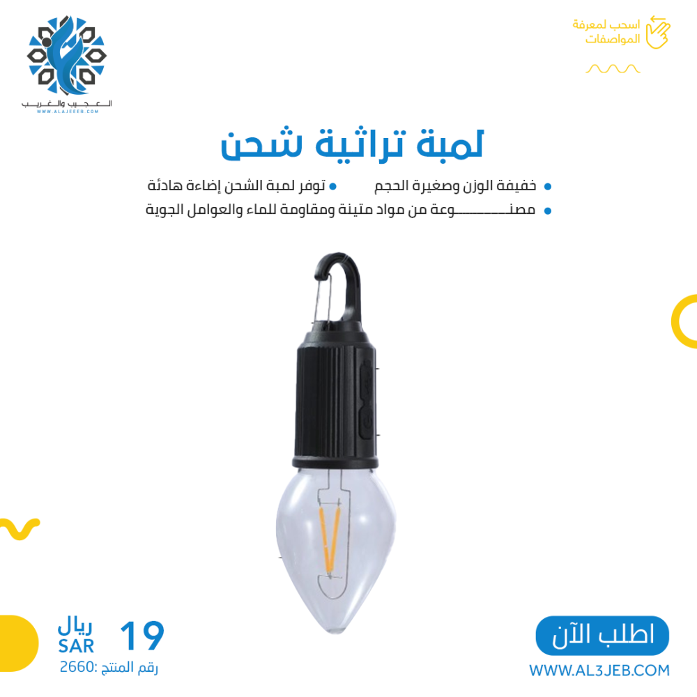 - استعد لتجربة إضاءة رايقة وفعالة في كل مكان مع لمبة الشحن، التي تجمع بين الأداء الممتاز والمرونة في الاستخدام.