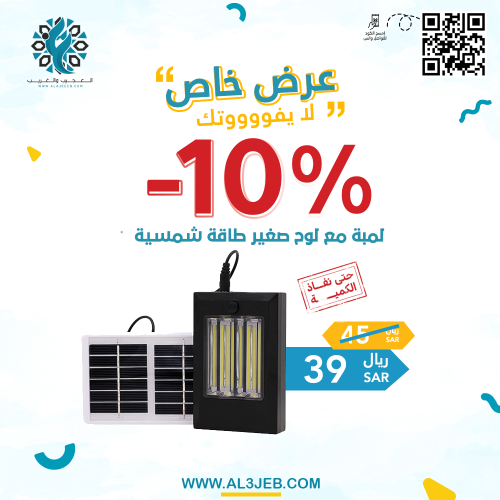 - يمكنك الحصول على "لمبة مع لوح صغير طاقة شمسية" الآن من متجر العجيب والغريب بالإضافة إلى الكثير من المنتجات الأخرى إذا قمت بزيارة موقعنا, قم بالطلب الآن نصلك بأقصى سرعة.