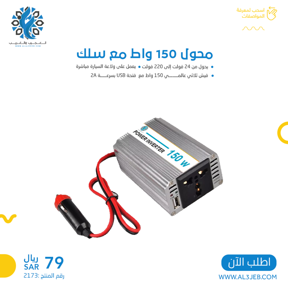 - يمكنك الحصول على "محول 150 واط مع سلك 24 فولت" الآن من متجر العجيب والغريب بالإضافة إلى الكثير من المنتجات الأخرى إذا قمت بزيارة موقعنا، قم بالطلب الآن نصلك بأقصى سرعة.
