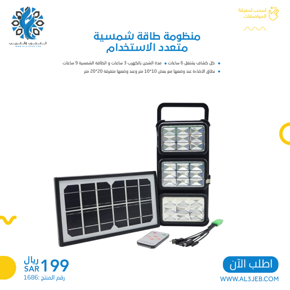 - هي منظومة تتكون من ( 3 كشافات لكل كشاف بطارية منفصلة ـ سلك شاحن متعدد ـ لوح طاقة شمسية ـ).